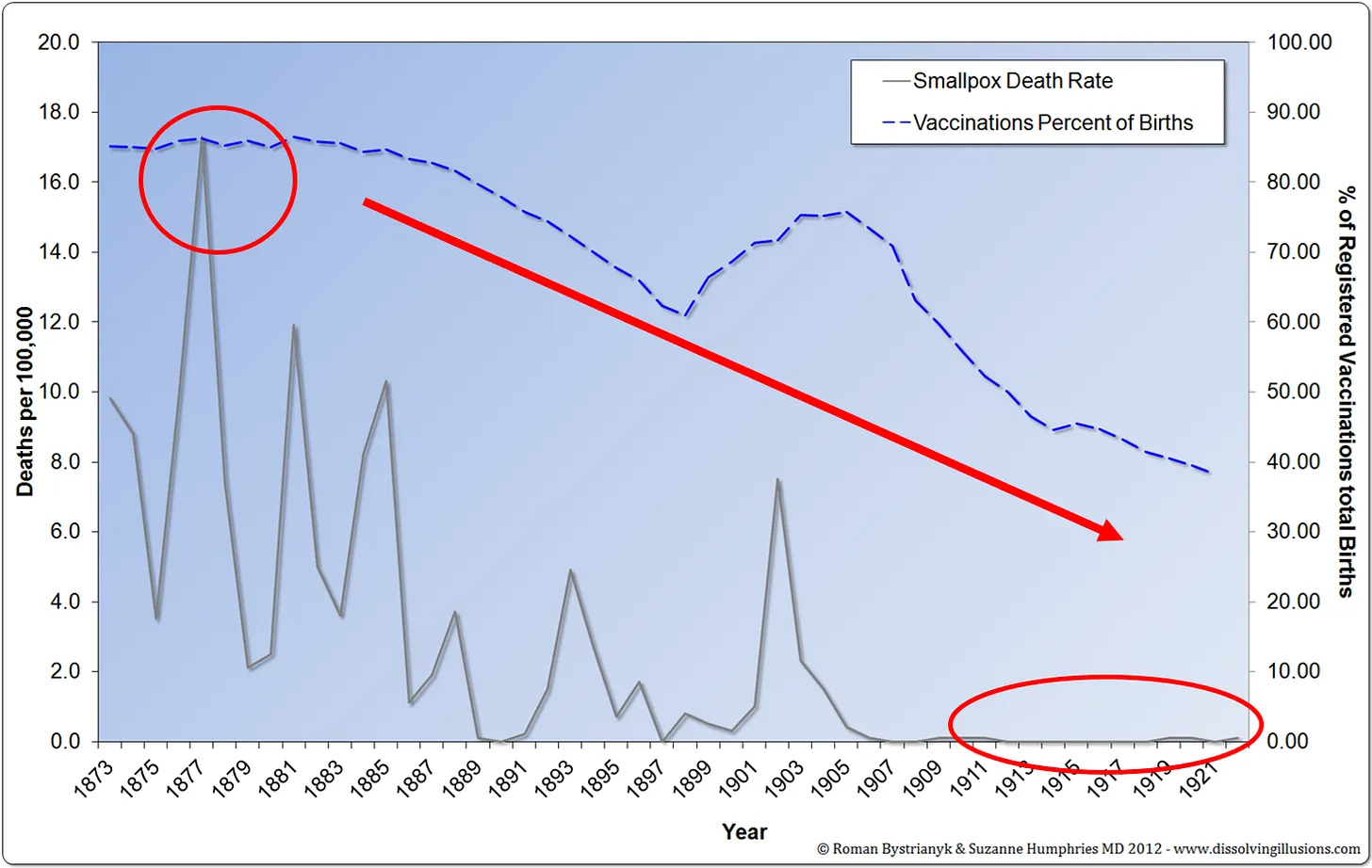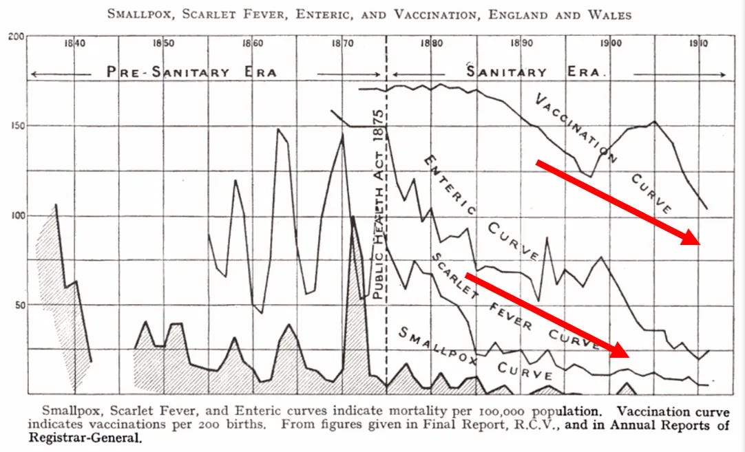 Αυτή η καθολική τάση είναι κρίσιμη για την κατανόηση της ευλογιάς. Όπως έδειξε το διάγραμμα του 1914 του Δρ. Millard, τα όρια θνησιμότητας για την ευλογιά και τις “άλλες ζυμωτικές (μολυσματικές) ασθένειες” μειώθηκαν σχεδόν παράλληλα από τη δεκαετία του 1870 και μετά. Αυτή η συγχρονισμένη κατάρρευση υποδηλώνει συντριπτικά μια κοινή αιτία - βελτιώσεις στην υγιεινή, τη διατροφή (ιδιαίτερα τη μείωση του υποσιτισμού), το καθαρό νερό, τις λιγότερο συνωστισμένες κατοικίες και την εγκατάλειψη επιβλαβών ιατρικών θεραπειών όπως η αιμορραγία και οι καθαρισμοί με βαρέα μέταλλα.