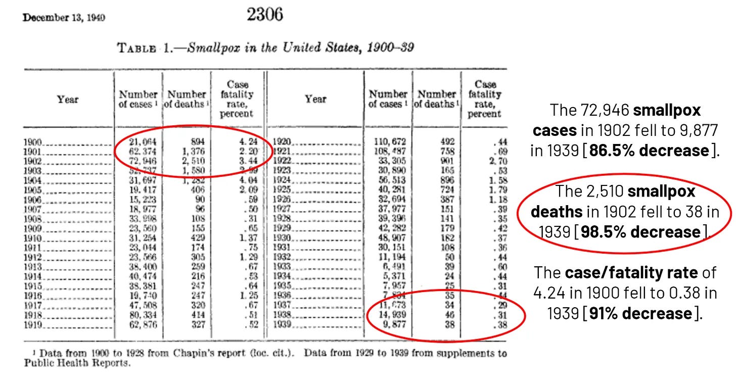 Ένα άρθρο του 1940 στο Public Health Reports έδειξε την συνεχώς καθοδική πορεία της ευλογιάς - τα κρούσματα, το ποσοστό κρουσμάτων/θνησιμότητας και οι θάνατοι μειώθηκαν κατακόρυφα. [30]
